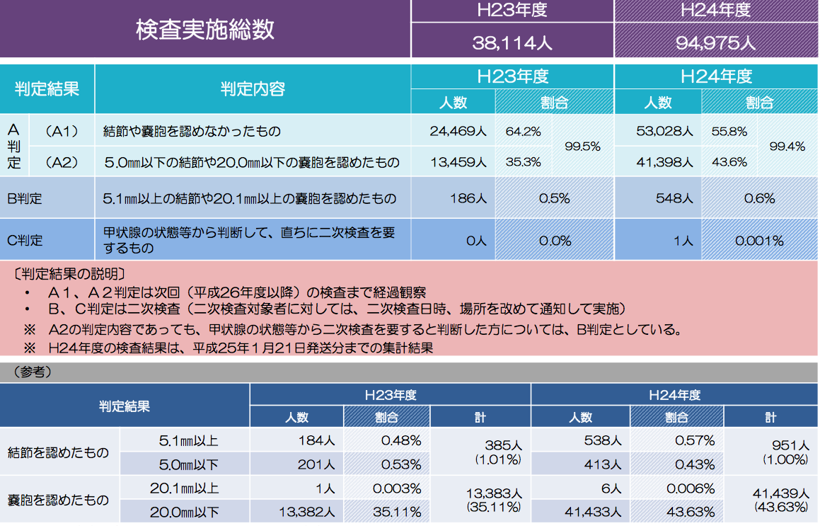 甲状腺検査結果概要を見ると、これまで総計133089人が検査され、A2判定54857人で41.2%、B判定734人で0.5%、C判定1人。表の下の部分の年度ごとの結節と嚢胞の数字を見ると、明らかに異常の割合が増えています。